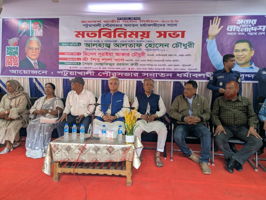 আসন্ন ত্রয়োদশ জাতীয় সংসদ নির্বাচন উপলক্ষে পটুয়াখালী-১ আসনে বিএনপি মনোনীত ধানের শীষের প্রার্থীর সমর্থনে পটুয়াখালী পৌরসভার সনাতন ধর্মাবলম্বীদের সাথে এক মতবিনিময় সভা অনুষ্ঠিত হয়েছে। শনিবার (০৭ ফেব্রুয়ারি) বেলা ১১টায় শহরের পুরান বাজারস্থ মদন মোহন আখড়াবাড়ী মন্দিরে এই সভার আয়োজন করা হয়েছে
