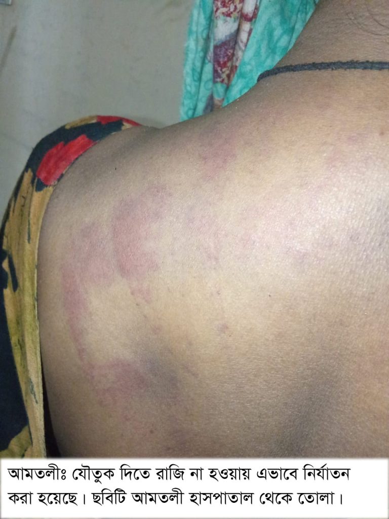 স্ত্রী শাহিনুর বেগম বলেন, বিয়ের পর থেকে নানা অযুহাতে যৌতুক দাবী করে আসছেন স্বামী। টাকা না দিলেই আমার উপর নির্যাতন চালায়। গত এক সপ্তাহ আগে জমি কিনবে বলে আমার কাছে তিন লাখ টাকা যৌতুক দাবী করেন। আমি টাকা দিতে রাজি না হওয়ায় আমার চোখে মরিচের গুড়ি দিয়ে আমার স্বামী, নুনুন্দা হানিফ মুসুল্লী ও ননদ রেবেকা বেধরক মারধর করেছে। আমি এ ঘটনায় জড়িতদের শাস্তি দাবী করছি।